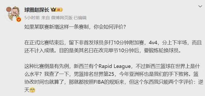 时间的缩短,利于增加比赛的紧凑激烈程度,但留给本土球员尤其年轻人发挥的机会可能随之变少。 所以据国内知名媒体人爆料,CBA新赛季准备在正式比赛结束后,提供10分钟的时间用于两队的非首发球员PK,且不计入成绩。 简单来说,本来一场比赛打4节,现在要打5节......