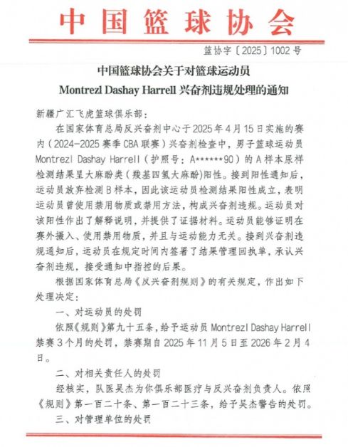 如今中国篮协时隔将近一个月,则是公布对于哈雷尔的处罚,而处罚结果与处罚吉伦沃特的一样,具体公告内容如下: 中国篮球协会关于对篮球运动员 哈雷尔兴奋剂违规处理的通知 新疆广汇飞虎篮球俱乐部: 在国家体育总局反兴奋剂中心于2025年4月15日实施的赛内(2024-2025赛季CBA联赛)兴奋剂检查中,男子篮球运动员哈雷尔(护照号:A******90)的A样本尿样检测结果呈大麻酚类(羧基四氢大麻酚)阳性。接到阳性通知后,运动员放弃检测B样本,因此该运动员检测结果阳性成立,表明运动员曾使用禁用物质或禁用方法,构成兴奋剂违规。运动员对该阳性作出了解释说明,并提供了证据材料。运动员能够证明在赛外摄入、使用禁用物质,并且与运动能力无关。接到兴奋剂违规通知后,运动员在规定时间内签署了结果管理回执单,承认兴奋剂违规,接受通知中指控的后果。