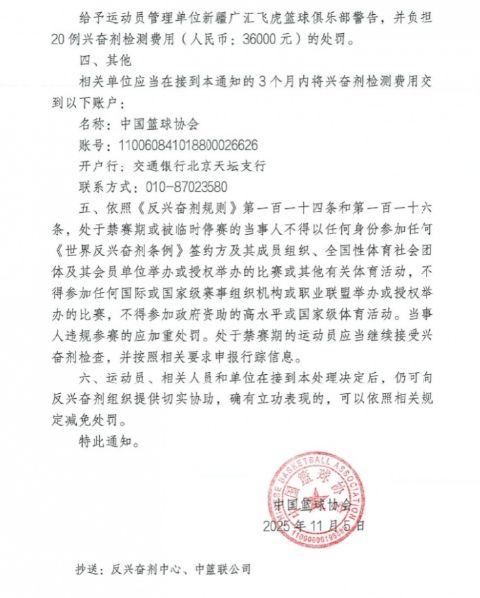 依照《反兴奋剂规则》第一百一十四条和第一百一十六条,处于禁赛期或被临时停赛的当事人不得以任何身份参加任何《世界反兴奋剂条例》签约方及其成员组织、全国性体育社会团体及其会员单位举办或授权举办的比赛或其他有关体育活动,不得参加任何国际或国家级赛事组织机构或职业联盟举办或授权举办的比赛,不得参加政府资助的高水平或国家级体育活动。当事人违规参赛的应加重处罚。处于禁赛期的运动员应当继续接受兴奋剂检查,并按照相关要求申报行踪信息。 六、运动员、相关人员和单位在接到本处理决定后,仍可向反兴奋剂组织提供切实协助,确有立功表现的,可以依照相关规定减免处罚。 特此通知。 2025年11月5日 抄送:反兴奋剂中心、中篮联公司 |