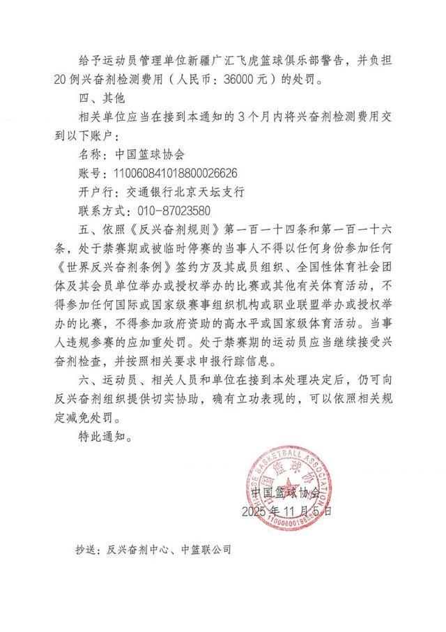 | 中国篮球协会发布通知,在2024-2025赛季CBA联赛赛内兴奋剂检查中,前新疆男篮运动员哈雷尔的A样本检测呈大麻酚类阳性,且其放弃检测B样本,违规成立。依据相关规定,给予该运动员禁赛3个月(2025年11月5日至2026年2月4日)的处罚;给予俱乐部医疗与反兴奋剂负责人吴杰警告处罚;给予新疆男篮警告,并令其承担20例兴奋剂检测费用36000元。同时明确了禁赛期相关限制及费用缴纳等其他事项。 原文件如下: 此前,前广东男篮球员吉伦沃特也因兴奋剂违规被禁赛3个月。 来源 东方体育日报 |