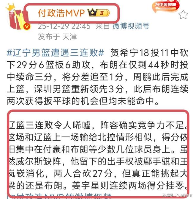 辽宁3连败,媒体人“三土带刺”社媒发文点:“辽篮最后时刻,连着两次三分机会没有把握住,客场不敌深圳,遭遇三连败。球队结束三连客,下一场31日,2025年收官战,主场对阵,张镇麟和弗格也将回到沈阳。辽篮目前这个情况,四连败有很大可能。而他们上一次四连败太久远了,还是2013年的12月中旬。”。