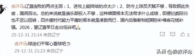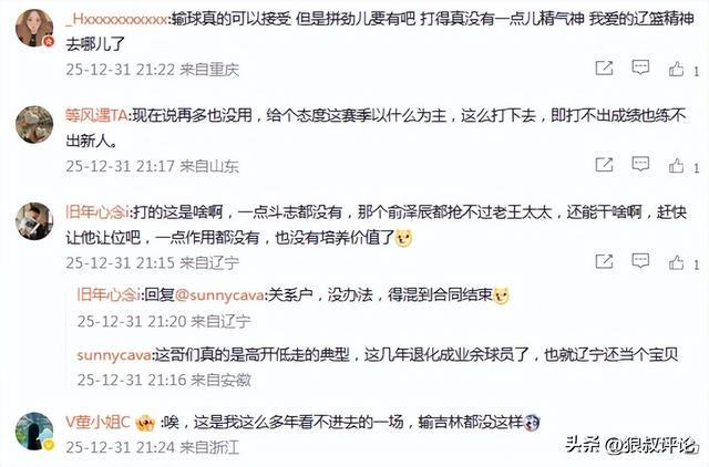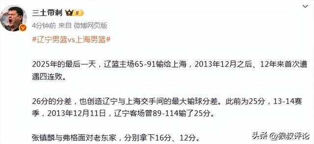| 北京时间12月31日,CBA常规赛继续开打,辽宁65-91不敌上海,新赛季遭到4连败。 本场比赛,辽宁外援全面失准,合计只有28中8拿到20分,表现最好的威尔斯10中4,拿到11分。 赛后,引起了球迷和媒体的热议。 媒体人“三土带刺”发文点评:“2025年的最后一天,辽篮主场65-91输给上海,2013年12月之后、12年来首次遭遇四连败。” 26分的分差,也创造辽宁与上海交手间的最大输球分差。此前为25分,13-14赛季,2013年12月11日,辽宁客场曾89-114输了25分。 张镇麟与弗格面对老东家,分别拿下16分、12分。 ” 媒体人“赵探长”发文点评:“理性是两支球队如今都开始新的时代,上海要冲冠,辽宁则要为季后赛而战。但更感性的一面是,今天这些瞬间好让人感动,这场比赛正好赶上跨年夜,而张镇麟就像是外出闯荡回家过节的孩子。” 在2025年最后一场比赛中,辽宁男篮主场65比91爆冷不敌上海男篮,以一场失利告别2025年。据统计,辽宁男篮赛季至今爆冷5次,近期更是4连爆。 球迷对于辽宁男篮主场遭到一场26分的惨败引发不满。 你说你年轻球员,现在是阵痛期,OK,那你态度呢,防守积极吗?抢篮板球吗?有投篮儿吗?年轻球员不练球的是吗?你投不进,起码你积极防吧,那阵地打不出来,你年轻你跑啊,打快攻啊,天天球一过半场就停那儿开始指挥,投又投不进,防又防不住,抢又抢不着篮板,我真的看不到为球迷而战的态度。 辽篮连败的两点主因:1、进攻上能终结的点太少;2、防守上球员天赋不够,导致顾此失彼,漏洞百出。总的来说就是俱乐部投入不够,这种牌面根本无法苛求什么成绩,即便纪委回归也不足以扭转,四外援时代能力平庸的根本就是凑数而已,国内后备断档短期弥补唯有花钱补强。2026,望辽篮早日走出低谷吧。 输球真的可以接受 但是拼劲儿要有吧 打得真没有一点儿精气神 我爱的辽篮精神去哪儿了 |