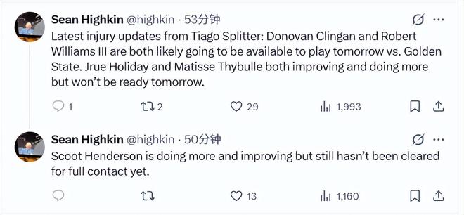 杨瀚森又没机会了克林根罗威预计明日复出开拓者伤病问题好转