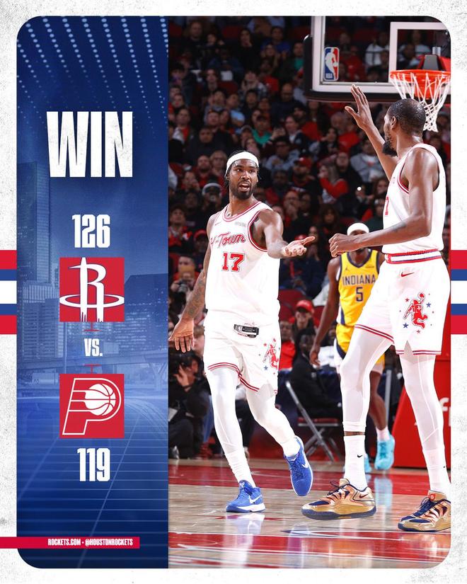 火箭队,小贾巴里史密斯16中8,三分球7中3砍下了21分10板2助3帽,在攻防两端爆发。小贾巴里史密斯已经连续6场15+创个人新高。阿门汤普森9中6高效的砍下了20分8板7助、伊森8中5独得13分8板1助、里德谢泼德12中6,三分球5中1得到13分1板3助2断、亚当斯8分5板、卡佩拉6分7板1助、芬尼-史密斯6分2板、奥科吉3分3板、泰特2分1助、戴维森2分1助、格林2分。 拒绝28分逆转!火箭3连胜反超湖人 在一度领先步行者28分的情况下,火箭在末节被对手将分差迫近至个位数,险些被步行者完成逆转。拒绝了28分逆转的休斯顿,得以斩获3连胜。此战之后,火箭的战绩来到了20胜10负,反超勒布朗詹姆斯、东契奇领军的湖人队(20胜10负),从而升至西部第4。紫金军团从西部第4跌至第5。 杜兰特30+6+5创NBA历史第3神迹 火箭队超级巨星凯文杜兰特,在此役迎来了爆发。杜兰特在34分钟的时间里,投篮20中13,三分球6中2,罚球3中2,狂轰30分6篮板5助攻1盖帽的数据,正负值+14高居全队第二。杜兰特以65%的命中率轰下了全场的最高分,在进攻端火力全开。并且,杜兰特的助攻次数高居全队第二,他在篮板保护和防守端的表现,也值得称赞。 凯文杜兰特
