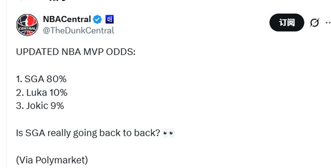 掘金官宣约基奇至少缺阵4周!当选MVP概率跌至第3亚历山大或蝉联