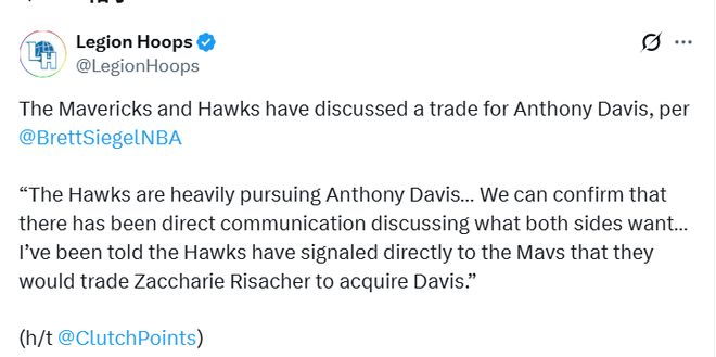 老鹰内部已就引进戴维斯的交易方案展开过讨论。假期前,这笔潜在交易并未有实质性进展,萨利赫团队仍在规划最优交易路径。马克-斯坦近期也暗示,老鹰为促成“合适的交易”愿意送走里萨谢。他还进一步报道称,老鹰希望在本赛季交易截止日前送走特雷-杨。 独行侠对交易戴维斯的想法同样十分开放。老鹰则已准备好与特雷-杨分道扬镳,且拥有里萨谢等筹码,足以向独行侠开出极具吸引力的报价。 那么,这笔交易真的会发生吗? 戴维斯加盟老鹰的交易不仅有可能达成,甚至可能演变成一场涉及多支球队的重磅交易。Sigele列出了一笔涉及老鹰、独行侠、国王、勇士和篮网的五方交易:戴维斯奔赴亚特兰大,特雷-杨、扎克-拉文、小萨博尼斯、克莱、库明加等多位球星也将牵涉其中。