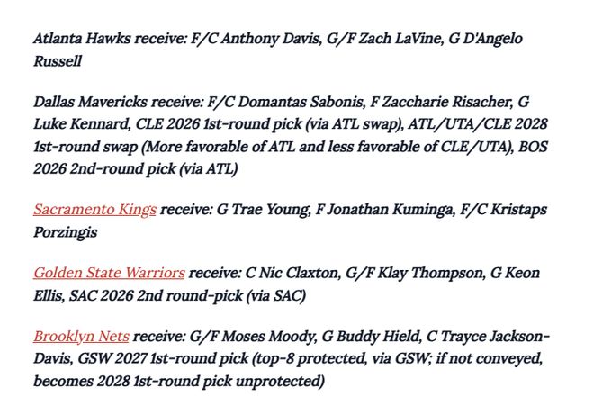 具体如下—— 老鹰得到:安东尼-戴维斯、拉文、拉塞尔 独行侠得到:小萨博尼斯、里萨谢、肯纳德、2026年骑士首轮签(通过老鹰互换)、2028年老鹰/爵士/骑士首轮互换权(取老鹰最优签与骑士/爵士较差签)、2026年凯尔特人次轮签(通过老鹰) 国王得到:特雷-杨、库明加、波尔津吉斯 勇士得到:克拉克斯顿、克莱、基翁-埃利斯、2026年国王次轮签 篮网得到:穆迪、希尔德、杰克逊-戴维斯、2027年勇士首轮签(前8顺位保护,若未兑现则转为2028年无保护首轮签) 大家如何看待这样的交易?欢迎留言发表见解。 |