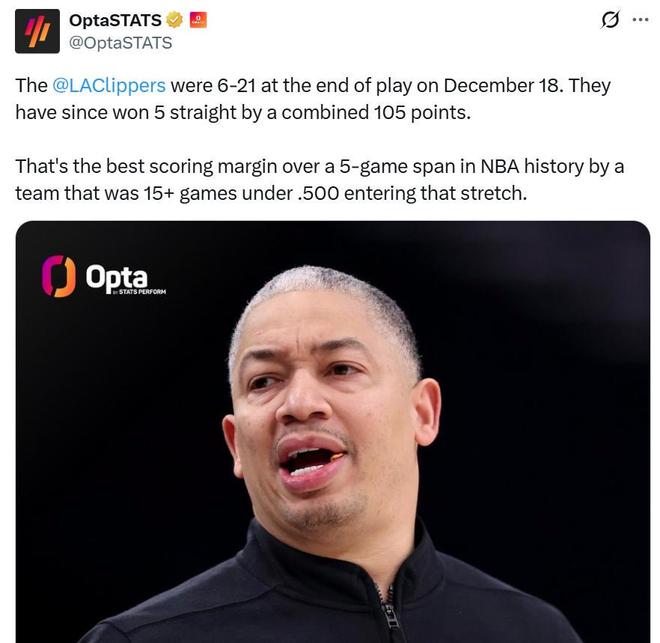 5连胜破纪录 值得一提的是,在开季表现远低于预期后,快船队将赛季目标调整为附加赛,按照快船队距离第十开拓者2.5个胜场的差距,以及快船队目前的状态,这一目标极有可能实现。 而此前泰伦卢公开表示球队剩余赛程的目标是35胜20负,在他公布这一目标后快船队豪取5连胜,也就是说快船队在剩余50场比赛拿下30胜20负即可。 凭借这样的表现,快船队不仅拿下现存最长的5连胜,还成为NBA历史上50%胜率以下(至少15场)球队5连胜的净胜分新纪录,过去5场比赛快船队净胜105分。