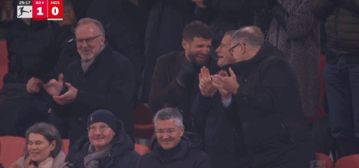 | 拜仁对阵美因茨的比赛中,场边镜头显示,穆勒与拜仁体育总监埃贝尔在看台上目睹小将伦纳特-卡尔为拜仁首开记录后,两人顿时喜笑颜开。