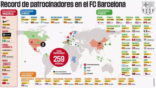 这一成绩来自赞助部门持续推进的工作。该部门在马尔克-布鲁伊克的领导下,致力于巩固既有的历史性合同,同时在全球范围内拓展新的合作伙伴,整体战略由俱乐部首席执行官马内尔-德尔里奥负责统筹。德尔里奥表示:“近年来,巴塞罗那足球俱乐部进行了清晰、坚定且结构非常完善的投入,旨在转型其商业模式,并适应全球足球面临的新挑战。”俱乐部方面强调,这一战略的成果,印证了在经历近年经济困难之后所采取的发展方向是正确的。 目前,巴塞罗那足球俱乐部在全球范围内拥有接近50家赞助商,合作伙伴遍布五大洲,展现出在地理分布上持续且均衡的国际化扩张。美洲市场中,合作伙伴包括来自墨西哥的宾堡、加拿大的丰业银行以及委内瑞拉的拉皮,美国则集中了多达12家不同赞助商,成为俱乐部在该领域的关键市场之一。 亚洲赞助商数量同样增长明显。巴萨目前与来自日本的科乐美、中国的DAKA以及将于2026年7月1日起生效的美的、韩国的SK ZIC和世邦、马来西亚银行以及中国香港的EBC保持合作关系。 在欧洲,巴萨的合作伙伴涵盖瑞典(Spotify,主赞助商)、荷兰(飞利浦/安必亮电视)、芬兰(HMD)、意大利(Rilastil)、葡萄牙(Azemad)等地,其中瑞典的Spotify是俱乐部主赞助商。非洲方面,民主刚果政府与巴萨达成合作,该协议将为俱乐部带来超过4000万欧元收入,但因该国长期面临人权问题指控,也成为近期最具争议的商业合作之一。 德尔里奥指出,这种增长并非短期现象。他表示:“在2021-22赛季到2025-26赛季之间,俱乐部的赞助收入增长了75%,年均增长率为15%。这一成果源于一项以收入多元化、为合作伙伴创造价值以及长期愿景为基础的战略。”