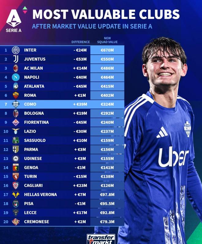 德转列意甲俱乐部身价排名:国米6.7亿欧第一,尤文5.5亿第二