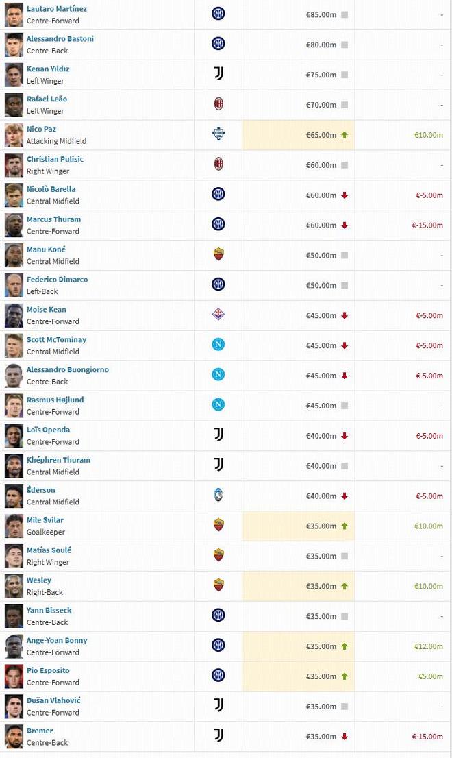 1.劳塔罗(国际米兰)8500万欧 2.巴斯托尼(国际米兰)8000万欧 3.伊尔迪兹(尤文图斯)7500万欧 4.莱奥(AC米兰)7000万欧 5.尼科-帕斯(科莫)6500万欧 6.普利希奇(AC米兰)6000万欧 6.巴雷拉(国际米兰)6000万欧 6.马库斯-图拉姆(国际米兰)6000万欧 9.夸迪奥-科内(罗马)5000万欧 9.迪马尔科(国际米兰)5000万欧 10.基恩(佛罗伦萨)4500万欧 10.麦克托米奈(那不勒斯)4500万欧 10.布翁焦尔诺(那不勒斯)4500万欧 10.霍伊伦(那不勒斯)4500万欧