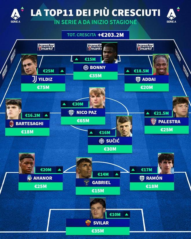 | 北京时间12月23日,在更新了意甲球员的身价之后,德转还列出了自2025-26赛季开始后,身价涨幅最高的11人阵容,尼科-帕斯暴涨3000万欧元第一,凯南-伊尔迪兹上涨2500万欧元第二,帕莱斯特拉上涨2150万欧元第三,巴尔泰萨吉、博尼以及苏契奇也都榜上有名。