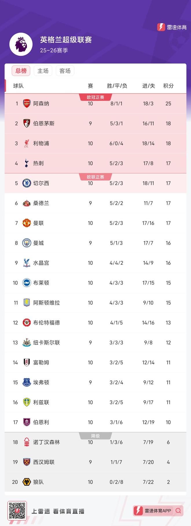 | 雷速体育11月2日讯 英超第10轮比赛已经7场战罢。最新积分榜方面,阿森纳8胜1平1负,目前以25分领跑。伯恩茅斯少赛一轮落后榜首7分,暂居次席。 利物浦2-0击败维拉之后暂升至第三,热刺、切尔西、桑德兰、曼联均17分。 |