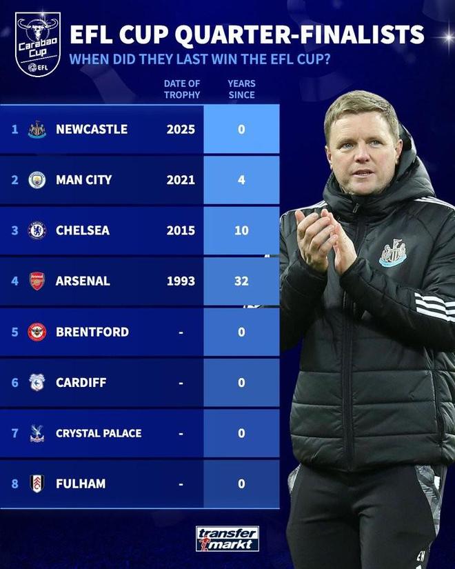 | 英联杯四分之一决赛将于本周打响,在此之际,德国转会市场列出了本赛季八强距离上次夺冠时间的榜单。