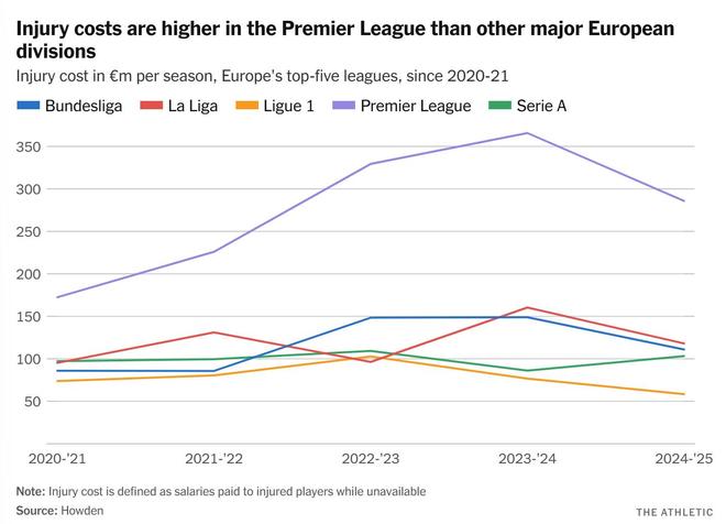 据Howden保险经纪公司最新发布的数据显示,过去五个赛季,球员伤病给英超俱乐部造成了10亿英镑的损失。 该公司长达286页的年度报告(数据来源于第三方公司的分析)发现,英超联赛的总体伤病频率在四个赛季内下降了25%,从2021-22赛季的峰值(1289例)降至2024-25赛季的957例。 在此期间,Howden所称的伤病“成本”(定义为球员的日基本工资乘以其因伤缺阵的天数)有所波动。 该总成本在四个赛季内(他们首次发布的报告始于2020-21赛季)上升,于2023-24赛季达到3.6569亿英镑的峰值,随后在上赛季下降了21.8%,至2.8574亿英镑。 总计过去五个赛季,欧洲五大联赛的伤病“成本”总额接近30亿英镑(他们假设俱乐部向受伤球员全额支付工资),其中40%来自英超球员。