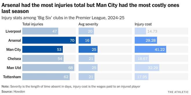 | 近日,The Athletic发表了专题文章,深入分析了英超联赛近年来备受关注的球员伤病问题及其带来的巨额财务影响。文章援引Howden保险经纪公司最新发布的年度报告指出,过去五个赛季,球员伤病已给英超俱乐部造成超过10亿英镑的薪资损失。尽管伤病总体频率有所下降,但伤病的严重程度与经济成本却显著攀升,揭示了现代足球在赛程密度、战术强度与球员健康管理之间面临的复杂挑战,以下为专题文章。