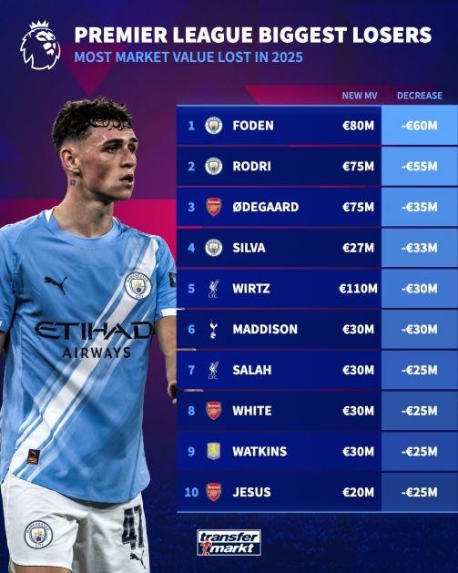 曼城在上赛季表现不佳,这让福登、罗德里、贝尔纳多-席尔瓦等球员的身价大幅下滑。其中,福登的身价从1.4亿欧元暴跌至8000万欧元,足足减少了6000万欧元,这让他排名榜首。值得强调的是,福登目前状态出色,如果延续这样的表现,那么他的身价将在2026年3月大幅提升。 长期因伤缺席的罗德里则排名第二位,在赢得2024年金球奖之后,罗德里身价飙升至1.3亿,但在2025年暴跌5500万,目前只有7500万。