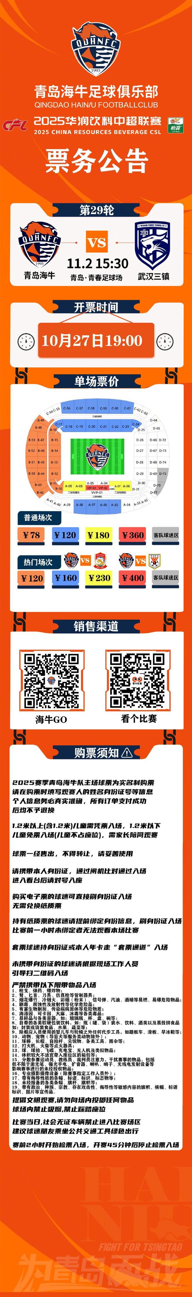 | 北京时间10月27日,青岛海牛官方发布票务公告,球队主场战武汉三镇的球票今日19:00开售。