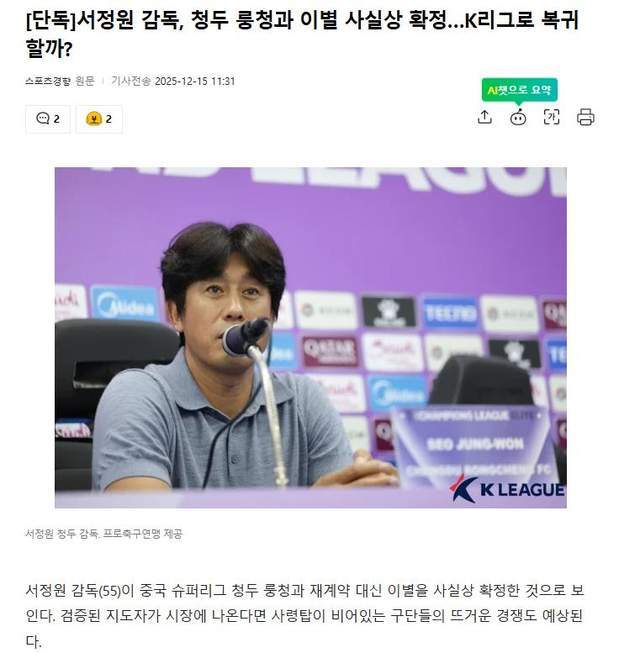 韩国记者透露,目前韩国联赛多支球队预计争抢徐正源,包括急需引进新帅的全北现代、蔚山现代和水原三星队,这3支球队都正在寻找新的主教练,徐正源在成都取得的成绩和丰富的执教经验,让徐正源都非常被韩国方面看好。