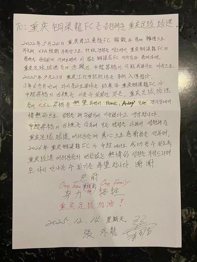2022年5月24日,重庆两江竞技FC解散,我也随之回到韩国。在韩国足协(KFA)担任技术副会长期间,我一边积累行政管理经验,一边始终关注重庆铜梁龙FC的表现。看着这支球队的成长,我越来越坚定地认为:只要和这群铜梁龙的球员并肩作战,就有机会实现重庆球迷多年来的心愿:回到中超平台。 带着这样的信念,我于2025年9月23日,经重庆江北国际机场再次入境。我曾许下承诺:我会再回来。 而我们三年六个月后最终能够完成冲超目标,离不开你们对冲超的热切期待。更离不开你们在每一场主场、每一场客场的热情助威。 在此,我向所有为冲超倾尽热情、全力支持球队的重庆球迷朋友们,致以最真挚的感谢。 也恳请大家继续支持重庆铜梁龙。希望在2026赛季的中超赛场能取得成功。 期待我们再次相见。 谢谢! 忍耐 努力 牺牲 One Team One Family 重庆足球加油! 2025年12月14日(星期日) 张外龙 |